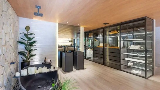Para o quarto, a marca executou um ripado orgânico para compor a decoração. Já o closet foi pensado como um guarda-roupa vitrine, trazendo muito vidro e prateleiras Luzze no acabamento Mocatto.