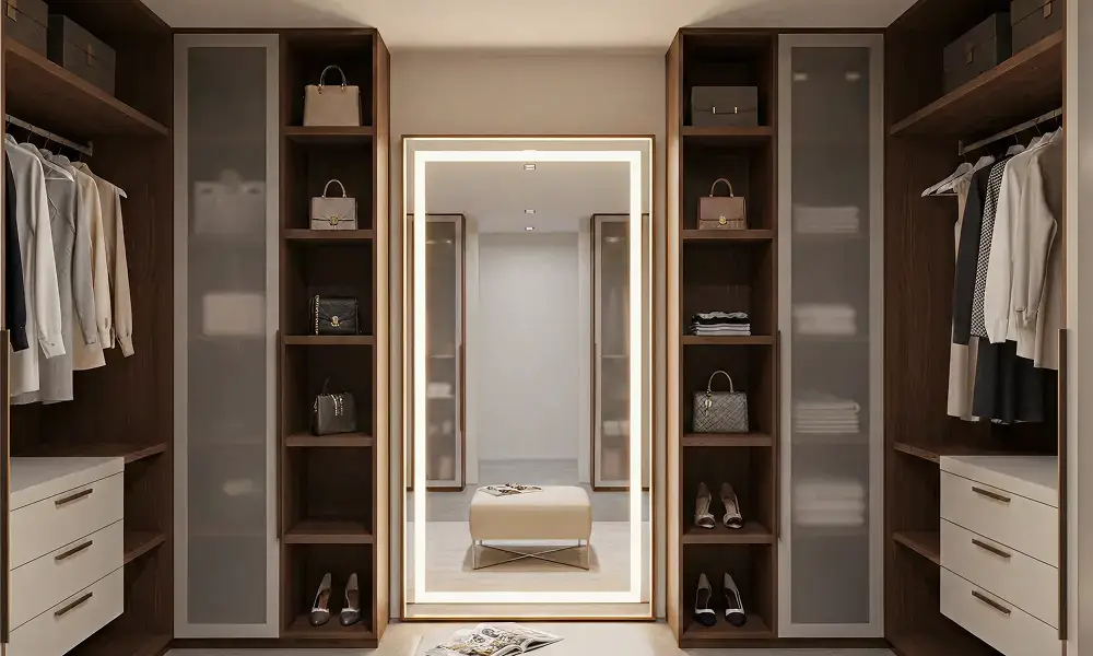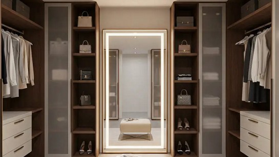 O espelho com iluminação integrada é um acessório que une funcionalidade e conforto. Além de auxiliar na composição do visual, ele amplia a sensação de espaço e melhora a iluminação geral do closet.