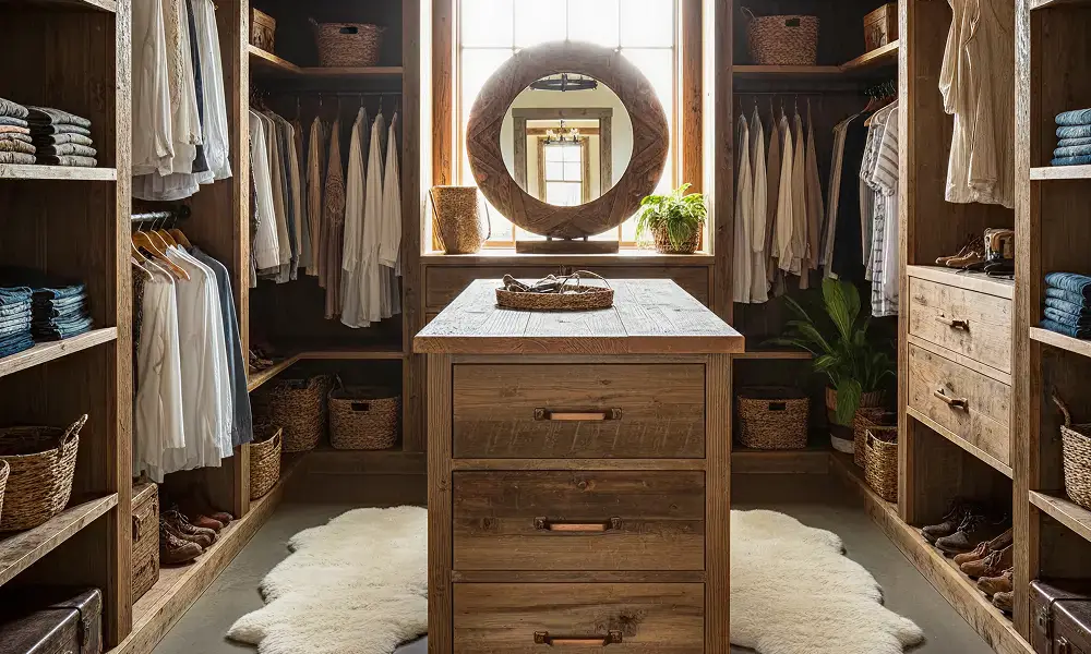 O closet rústico traz referências naturais e acolhedoras. Tons amadeirados, texturas aparentes e materiais com aspecto mais orgânico criam atmosfera de conforto e proximidade.