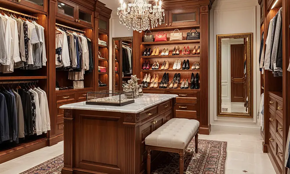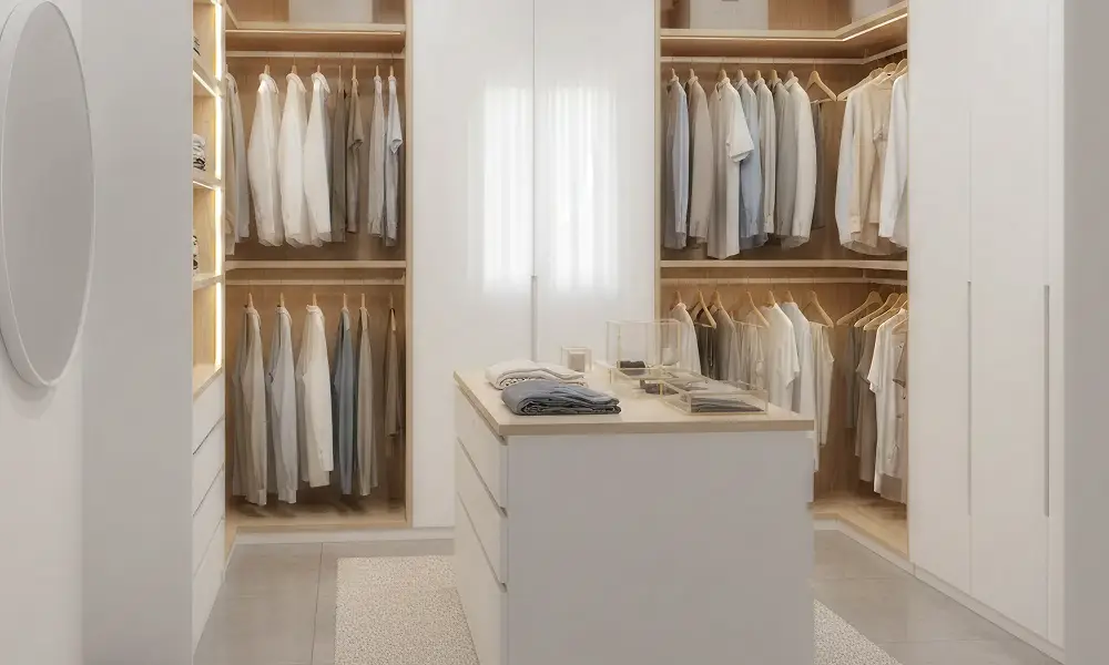 Quando o espaço permite, o layout em U favorece organização intuitiva e acesso rápido a todas as peças, transformando o closet em um ambiente completo de uso diário.