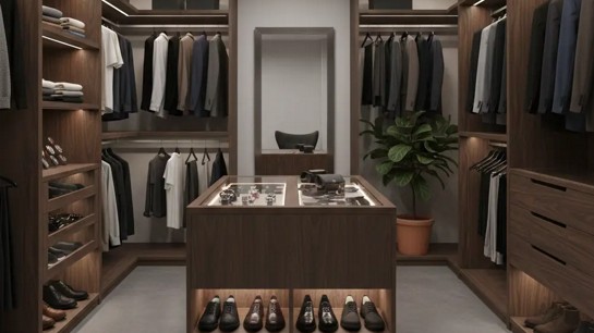 Já o closet masculino tende a priorizar cabideiros contínuos e bem dimensionados, com compartimentos específicos para camisas, calças, blazers e peças dobradas. Gavetas para cintos, gravatas, relógios e carteiras são frequentes, assim como uma organização mais direta e de fácil manutenção.