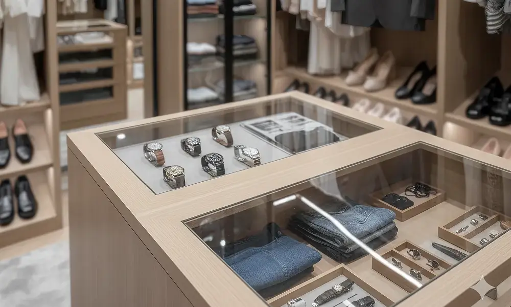 As prateleiras destinadas a bolsas devem ser planejadas para evitar deformações e facilitar a visualização. O ideal é que cada bolsa tenha apoio individual ou espaçamento suficiente para não ser comprimida por outras peças.