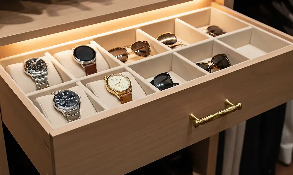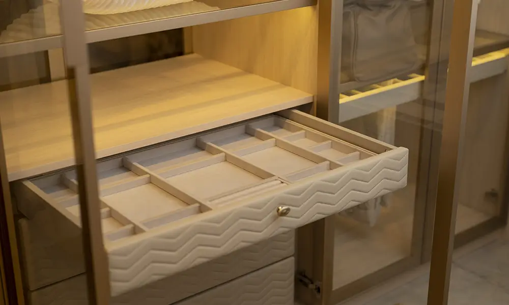 As divisórias internas complementam as gavetas, criando compartimentos específicos para cintos, lenços, relógios, óculos e outros acessórios menores. Essa setorização evita misturas, reduz o desgaste das peças e torna a rotina mais prática.