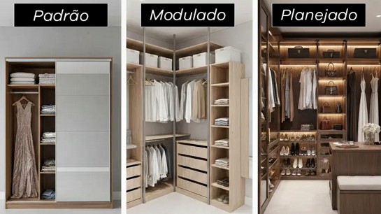 O closet modulado é composto por módulos pré-dimensionados que podem ser combinados entre si. Ele funciona como uma solução intermediária entre o guarda-roupa tradicional e o closet planejado sob medida.