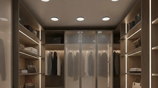 Quando integrada a prateleiras, gavetas e cabideiros, a iluminação elimina sombras internas e melhora significativamente a experiência de uso. Em projetos residenciais, costuma-se trabalhar com temperaturas de cor entre 3000K e 4000K, equilibrando conforto e fidelidade das cores das roupas.