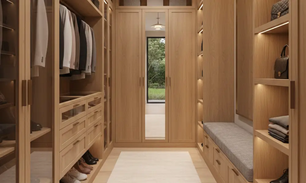 O closet em madeira clara transmite leveza, amplia visualmente o ambiente e funciona bem em espaços pequenos ou com iluminação natural limitada. É uma escolha frequente em projetos contemporâneos e em closets integrados ao dormitório.